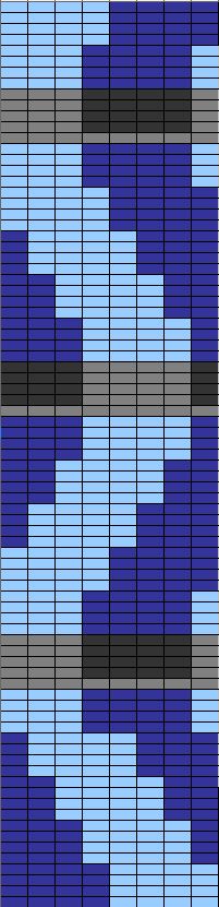 Bulur: Kasta 100 eygu upp á við svørtum á stokk nr 3. Bind 2 røtt og 2 rong 4 umfør. Skift til blátt og bind 3 umfør 2 røtt og 2 rong, skift aftur til svart og bind 5 umfør 2 røtt og 2 rong. Á síðsta umfari verður tikið upp á til 128 eygu.